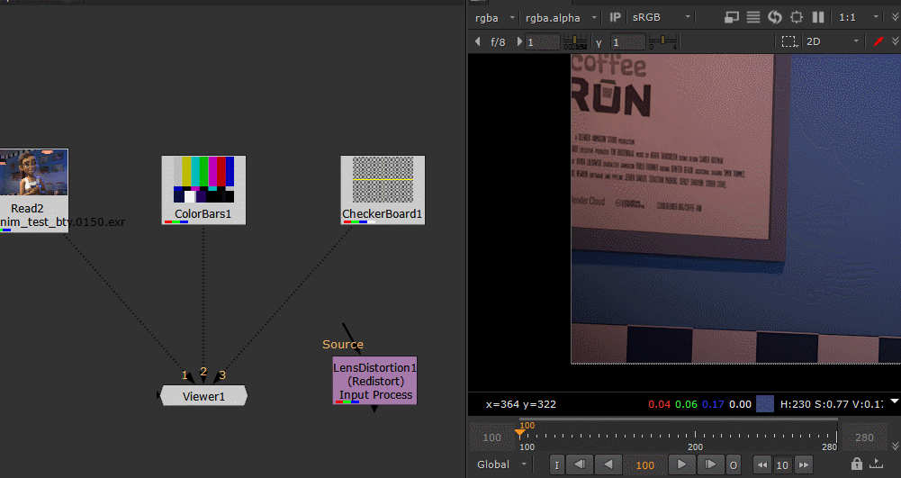 This is probably my most used Input Process. We often find ourselves working in comps with a single lens distortion near the bottom of the pipe, but are working all over the script. This means you can miss edge issues that are happening outside the format, before the lens distortion is applied. Well no more, with a LensDistortion set as your IP, you will always see the edge issues as you are working!