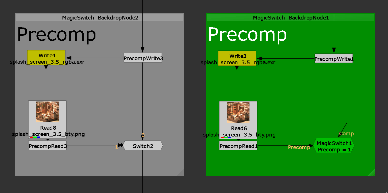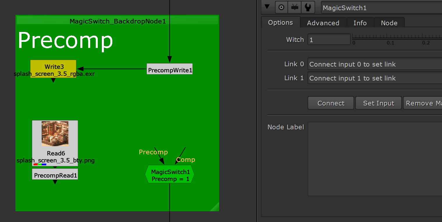 The reason I made this was because I found that working in very large nuke files got faster if you disconnected portions of the node tree. A normal switch doesn’t completely bypass what is upstream, for whatever reason… so the MagicSwitch was created to test that theory. In practice I have found it keeps my large scripts much lighter, while still providing the same benefits as a normal switch node.