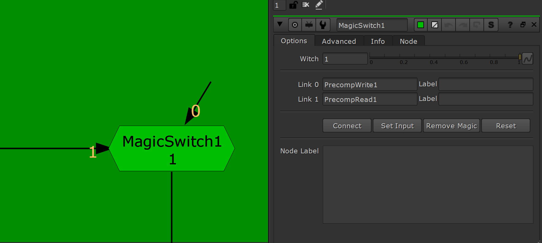 After the MagicSwitch is setup, it is functionally the same as normal Switch. You can set the Witch knob value to change the inputs, or disable the node to revert to a value of 0. The only major difference is the MagicSwitch has a limit of 2 inputs, at this time