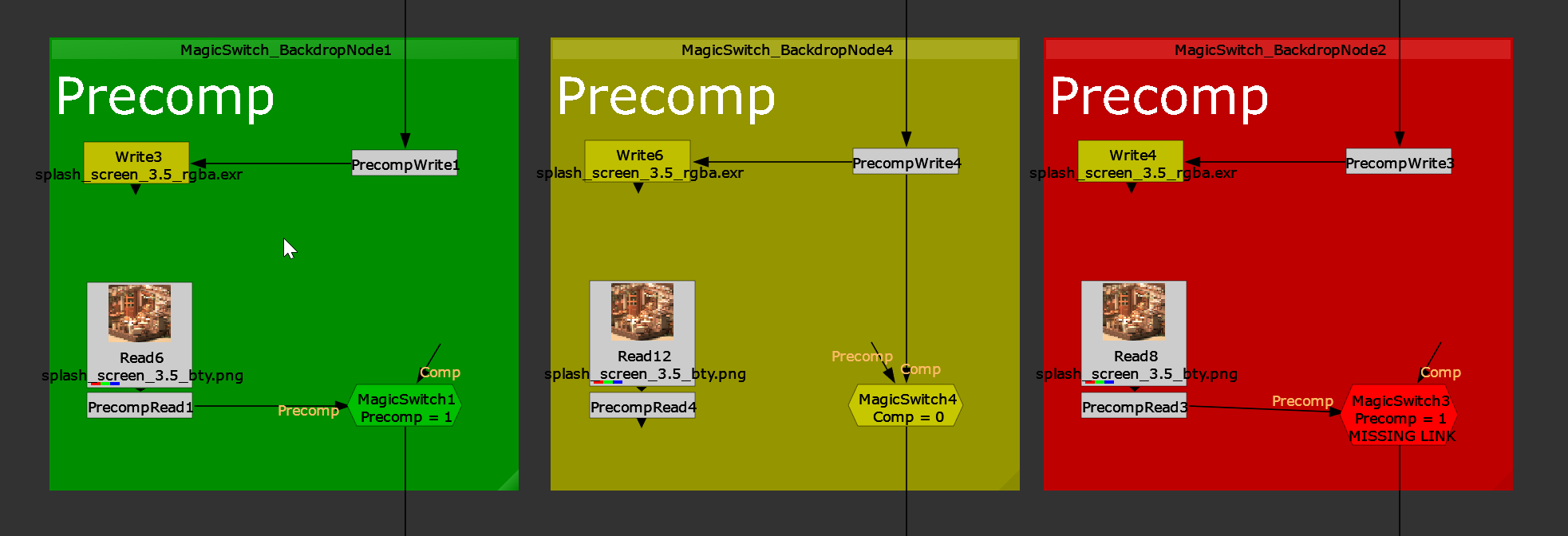 If you put a MagicSwitch node on a backdrop that’s name starts with “MagicSwitch_” the backdrop will adopt the same colours as the MagicSwitch. This is useful for quickly spotting the state of the MagicSwitch when zoomed out, or when quickly scanning the node graph